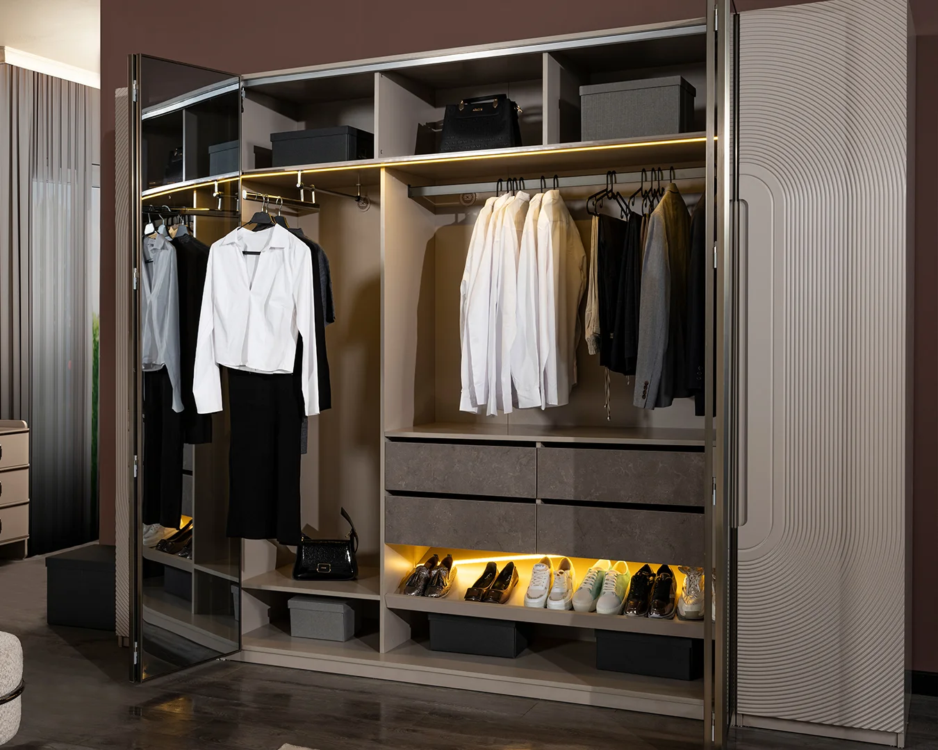 Elsey Home modern gardırop modelleriyle estetik ve işlevselliği bir araya getirin. Geniş iç hacim, kaliteli malzemeler ve kişiye özel tasarım seçenekleriyle yaşam alanlarınıza düzen ve zarafet katın.